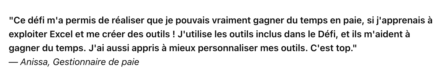 ✅ 1 défi pratique par semaine pendant quatre semaines : chaque semaine, recevez un fichier Excel concret de paie (charges, IJSS, effectifs, etc.) avec votre défi