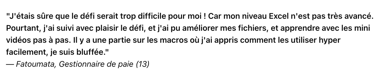 Et si vous êtes déjà à l’aise, les défis vous permettront d’aller plus loin, notamment avec les macros simples ou des formules un peu plus poussées.